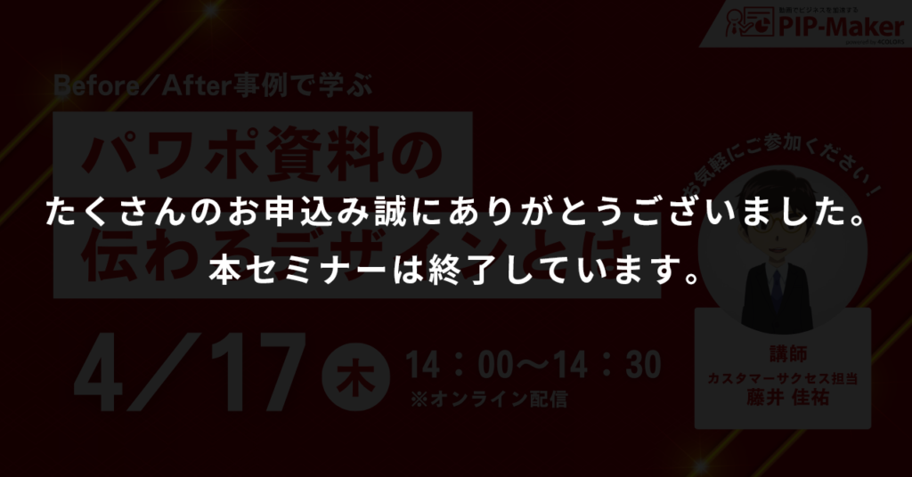 | 内容 | ◆ Before/After事例で学ぶ パワポ資料の伝わるデザインとは ◆ |